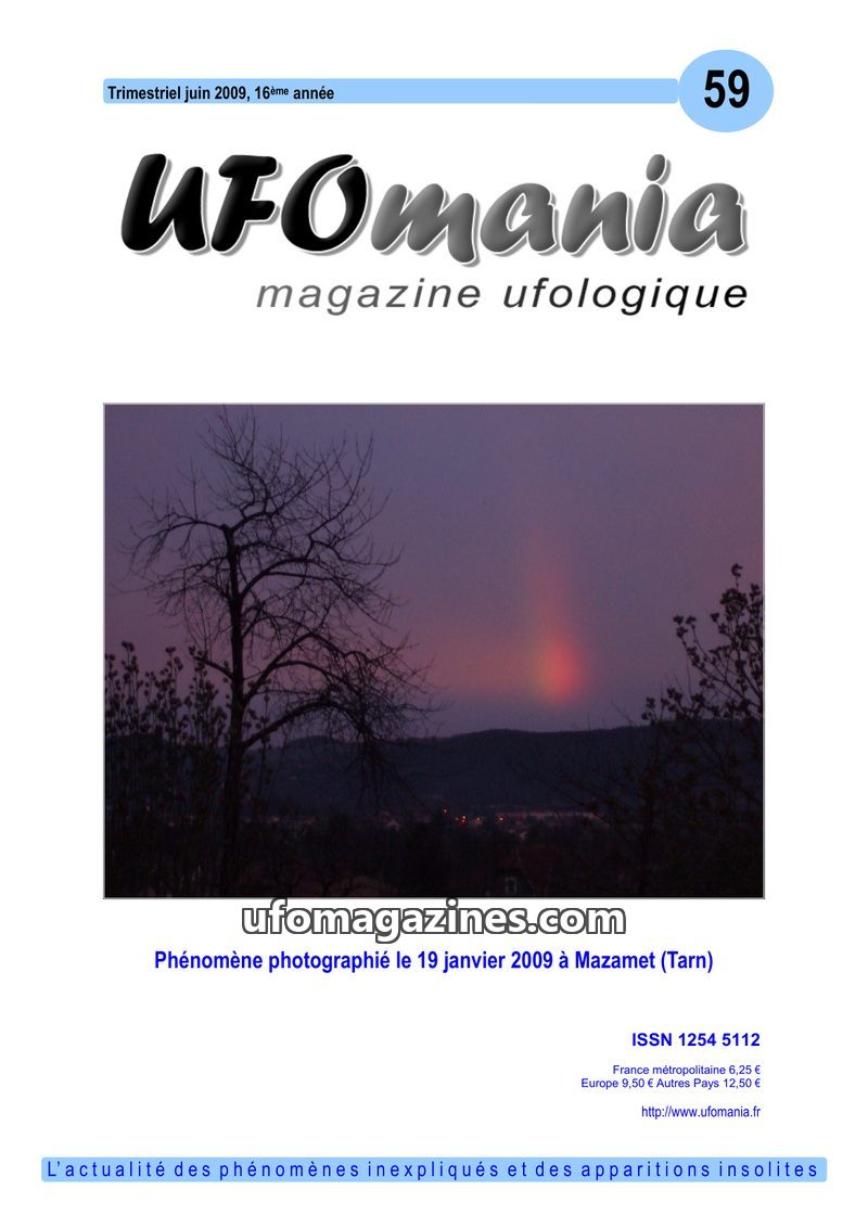 This issue of UFOmania magazine (June 2009) features a cover story on a phenomenon photographed in Mazamet, Tarn, on January 19, 2009. It includes an investigation into a sighting