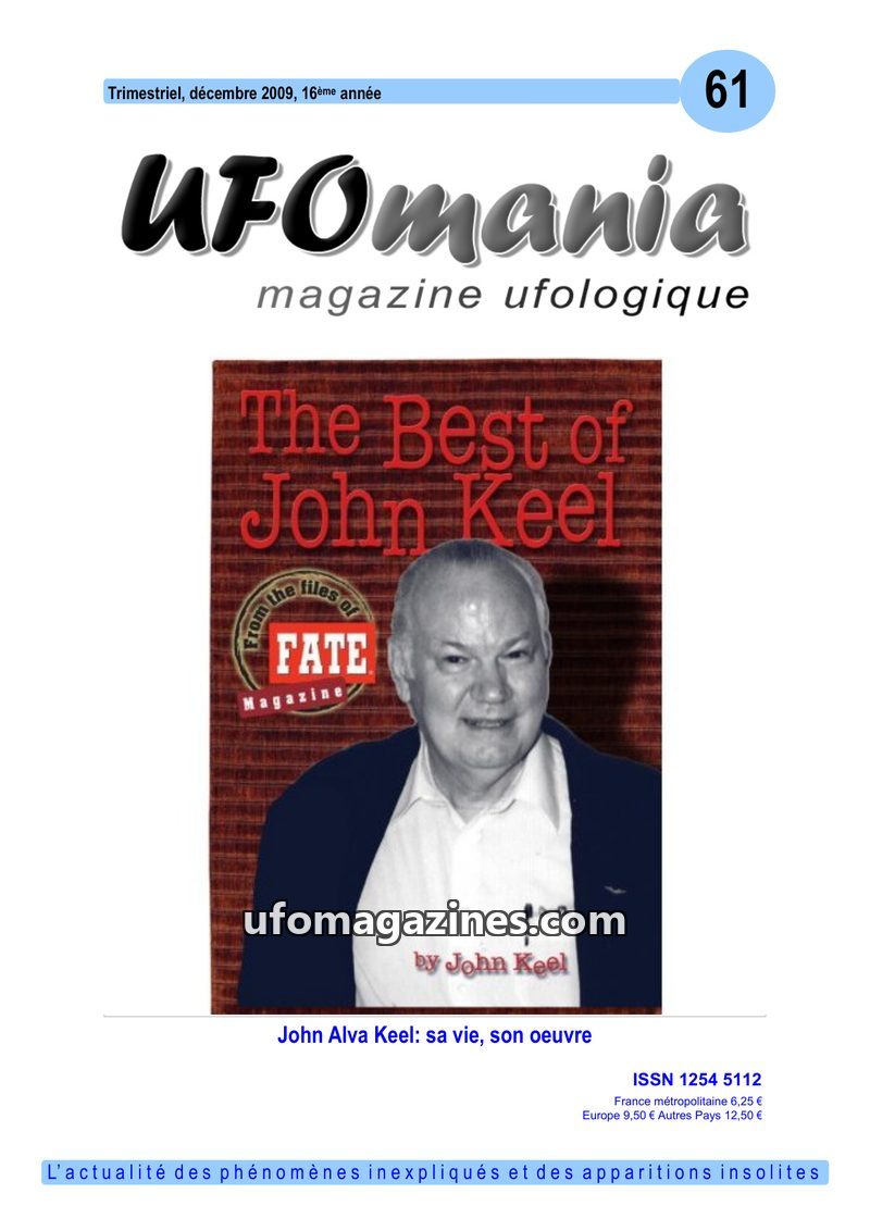 This issue of UFOmania magazine (No. 61, December 2009) features a special dossier on the life and work of ufologist John Alva Keel, who passed away in July 2009. Keel is known for