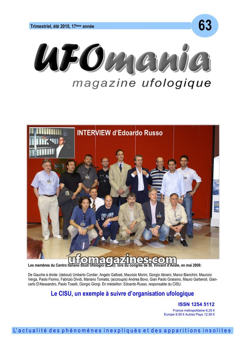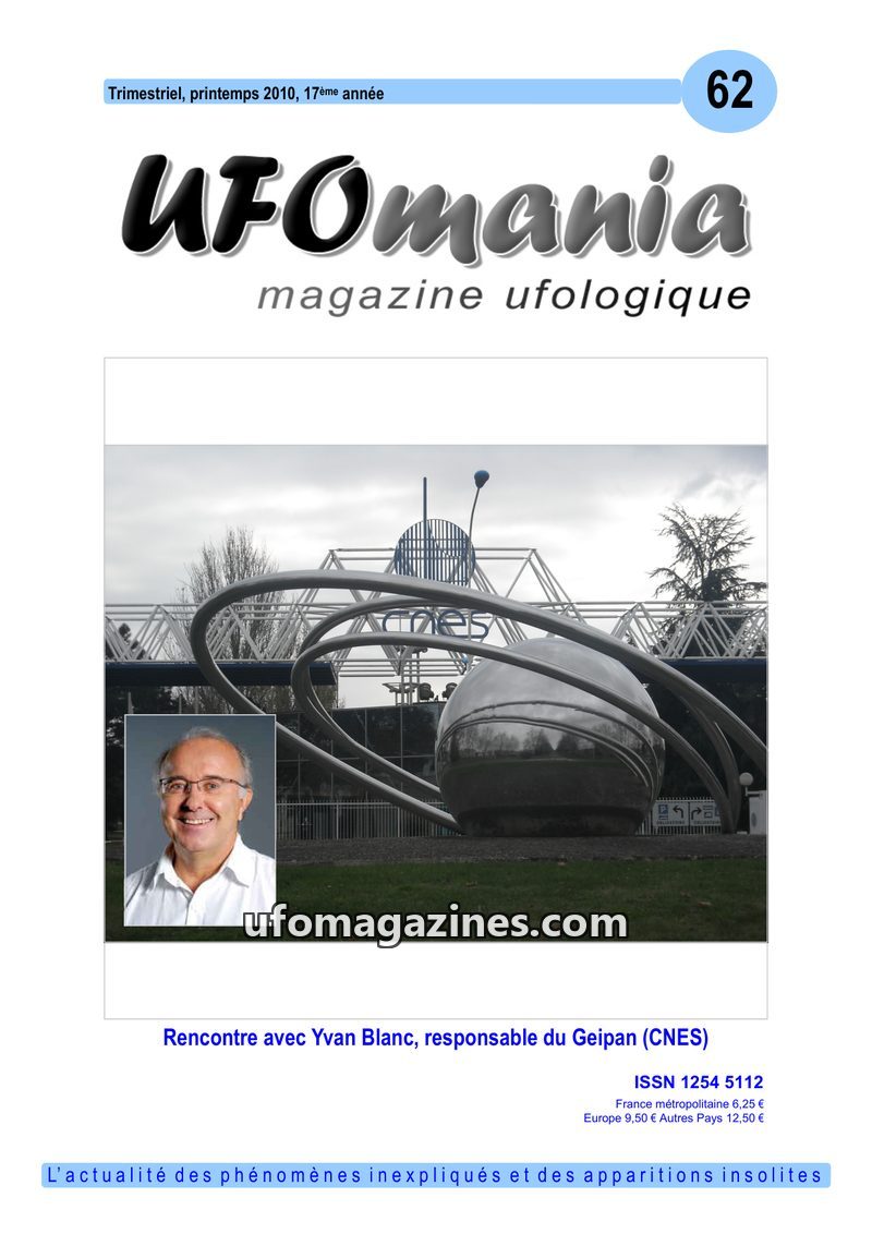 This issue of UFOmania magazine (Spring 2010, issue 62) focuses on an interview with Yvan Blanc, the new head of Geipan (CNES), discussing the organization's role and future. It hi