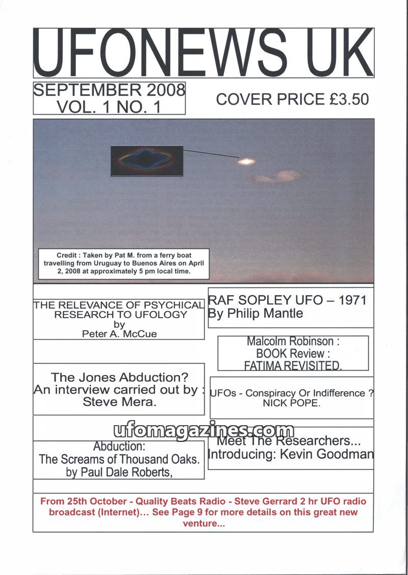This issue of UFONEWS UK, Volume 1 No. 1, dated September 2008, covers a range of UFO-related topics. Articles include an examination of the relevance of psychical research to ufol
