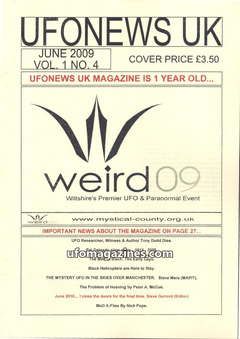 This issue of UFONEWS UK marks its first anniversary and features a range of UFO-related news and reports. It includes an obituary for UFO researcher Tony Dodd and a report on the