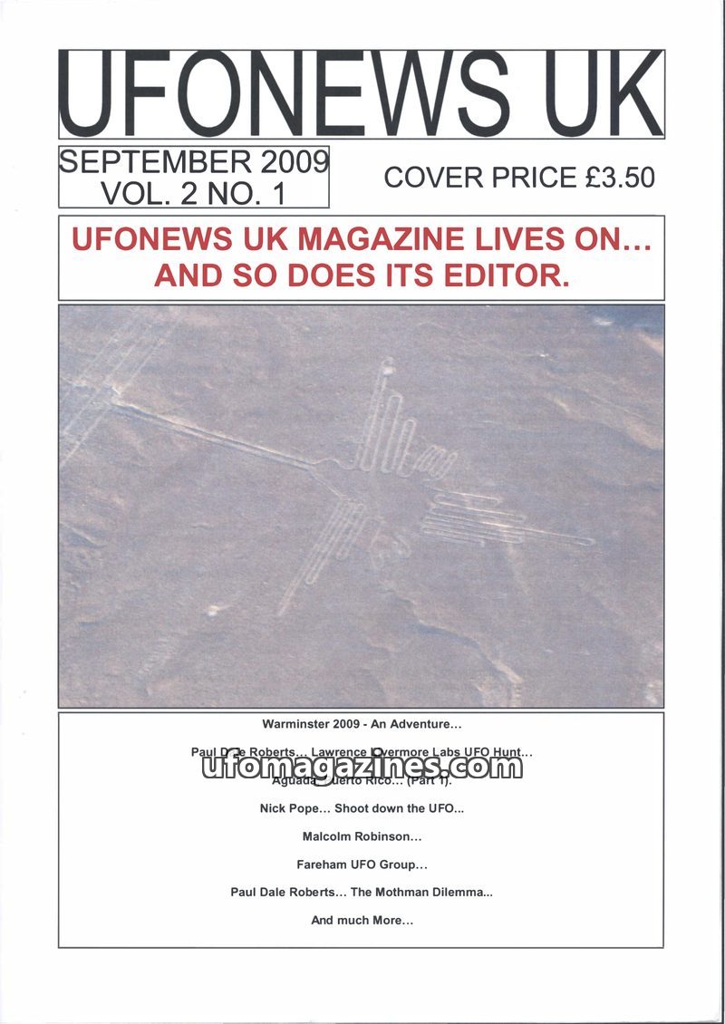 The September 2009 issue of UFONEWS UK confirms the magazine's continuation despite pressures, with the editor deciding not to retire. The issue features numerous UFO sighting repo
