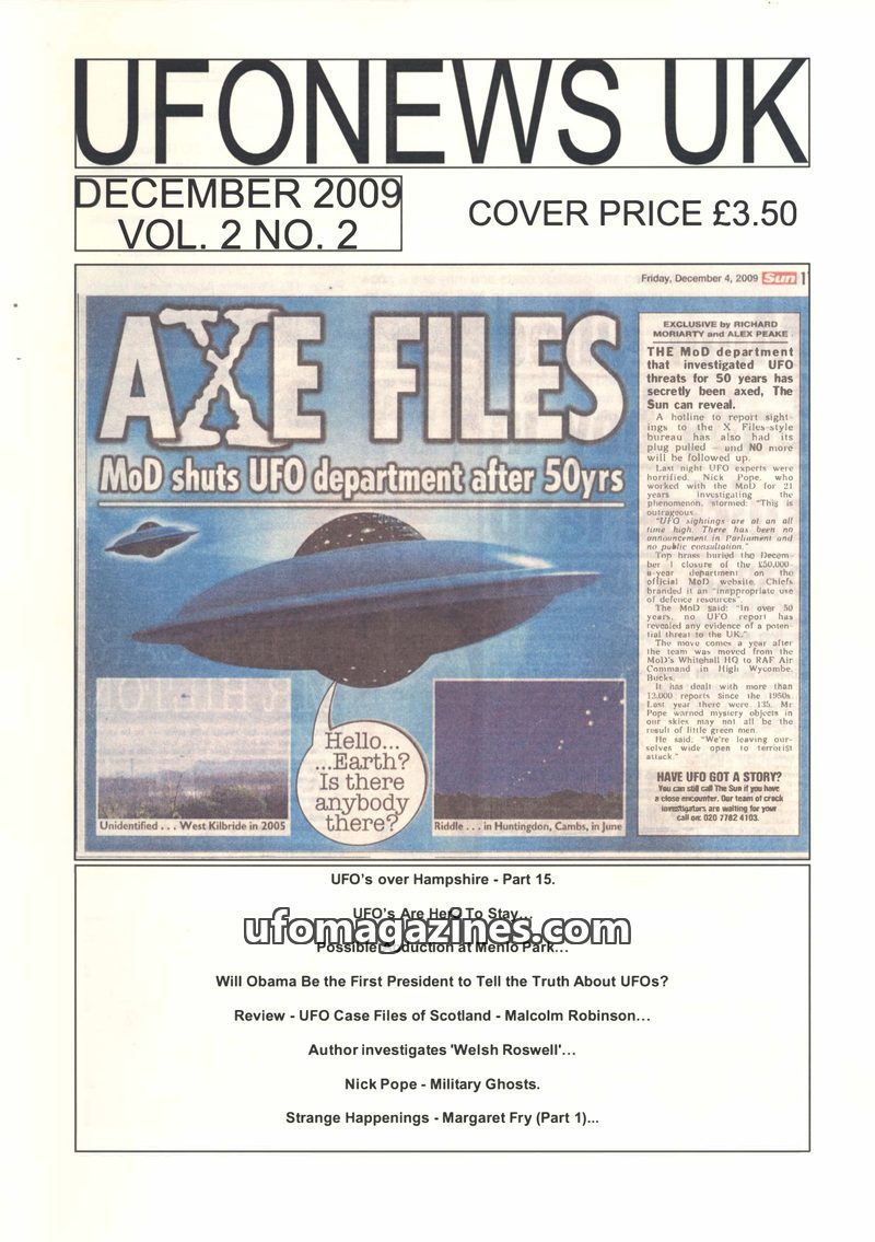 The December 2009 issue of UFONEWS UK reports on the closure of the UK Ministry of Defence's UFO department after 50 years, a move criticized by UFO experts. The magazine also deta