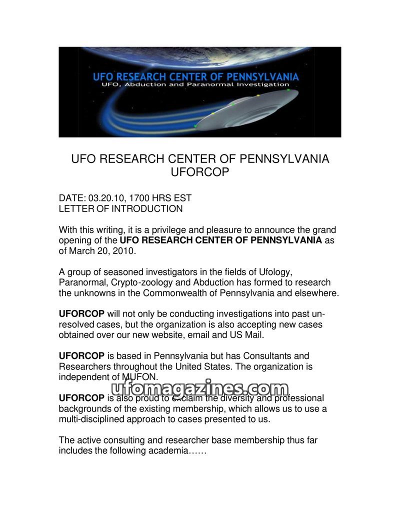The UFO RESEARCH CENTER OF PENNSYLVANIA (UFORCOP) officially opened on March 20, 2010. This organization is comprised of seasoned investigators in Ufology, Paranormal, Crypto-zoolo