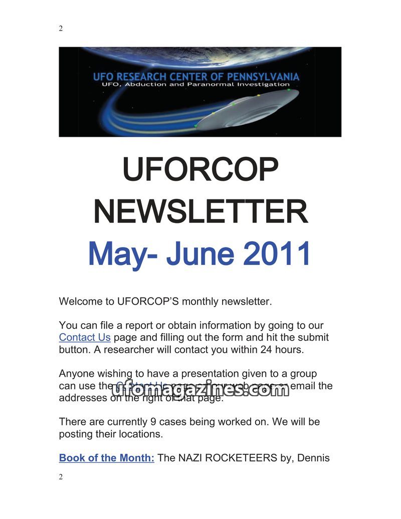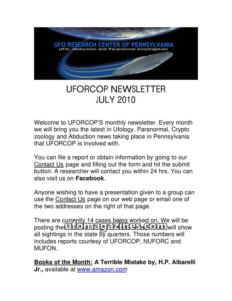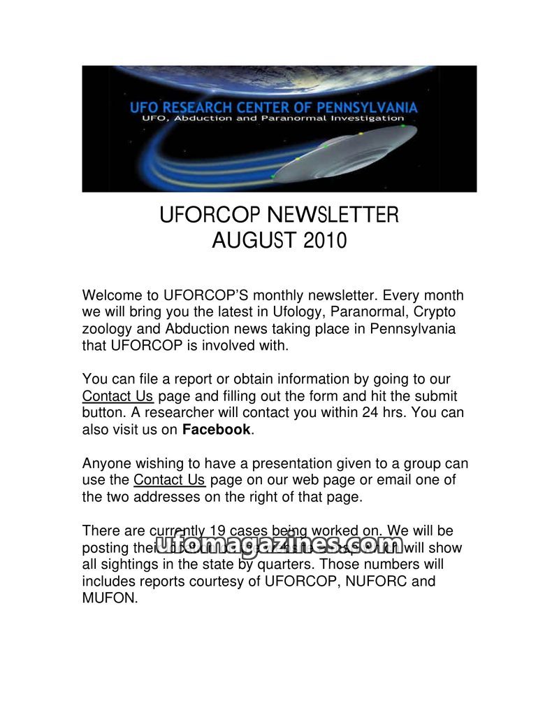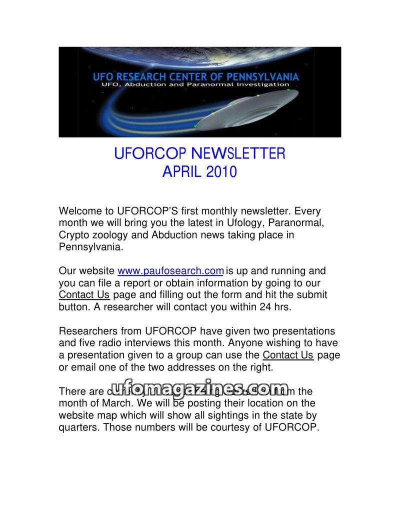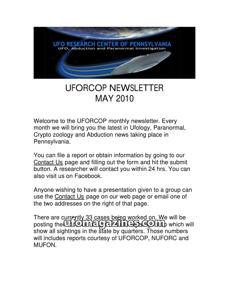 The May 2010 UFORCOP Newsletter covers recent developments in ufology, paranormal phenomena, cryptozoology, and abduction cases within Pennsylvania. The organization is actively wo