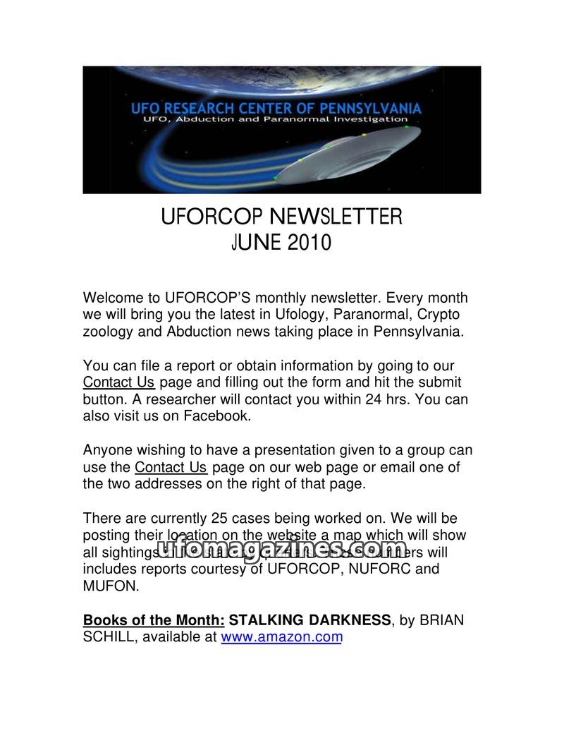 The June 2010 UFORCOP Newsletter highlights ongoing investigations into UFO sightings, including one over a Pennsylvania Nuclear Plant. The organization is also planning paranormal