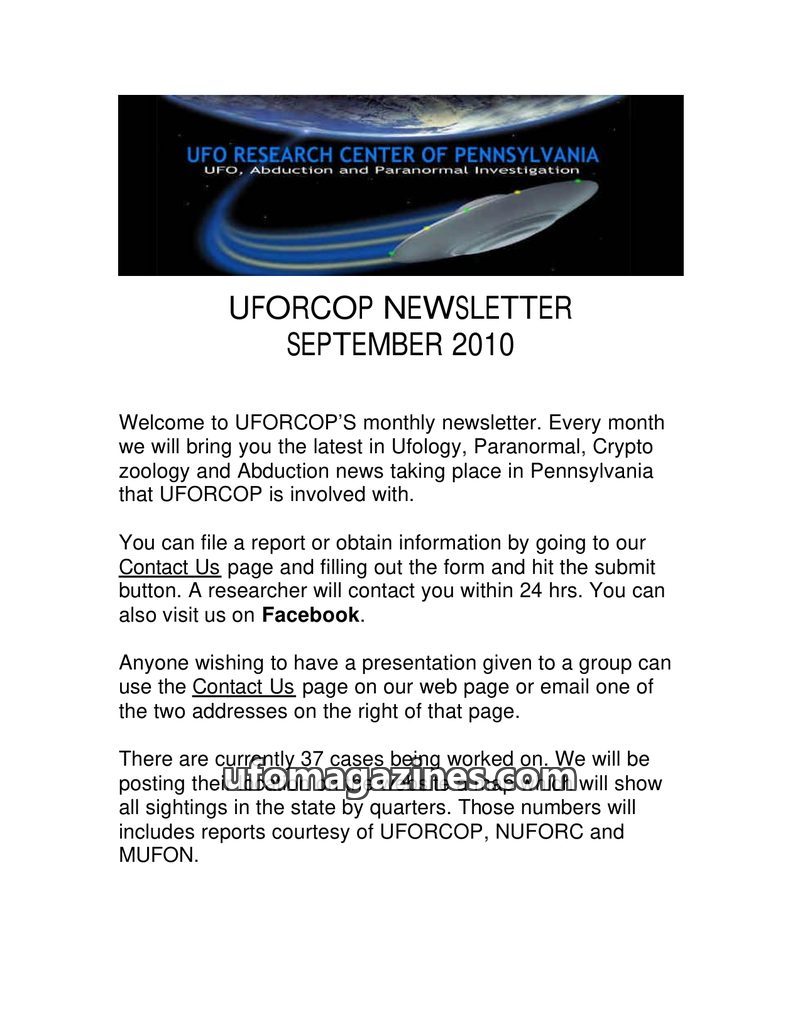 This September 2010 newsletter from the UFO Research Center of Pennsylvania (UFORCOP) details ongoing investigations into UFO, paranormal, cryptozoology, and abduction cases within