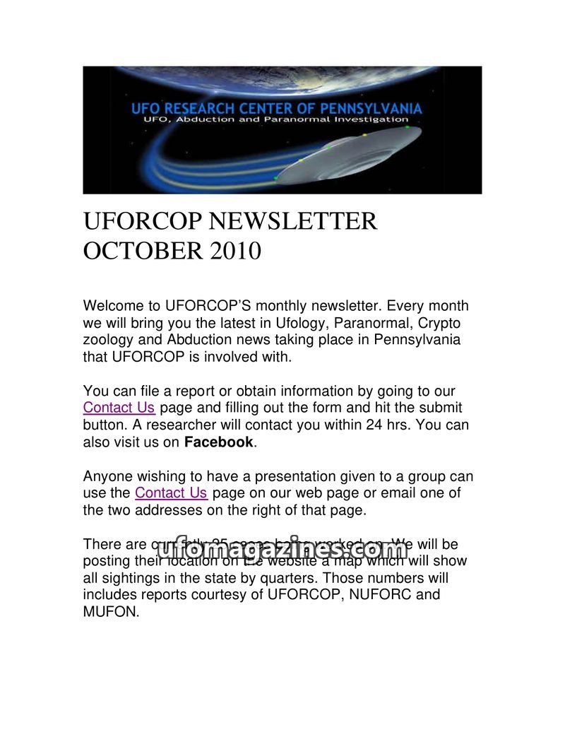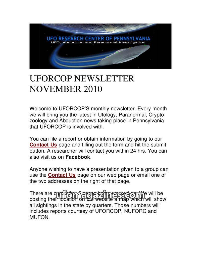 This November 2010 UFORCOP newsletter details the organization's ongoing investigations into UFOs, Cryptozoology, and Paranormal phenomena in Pennsylvania. UFORCOP is actively rese
