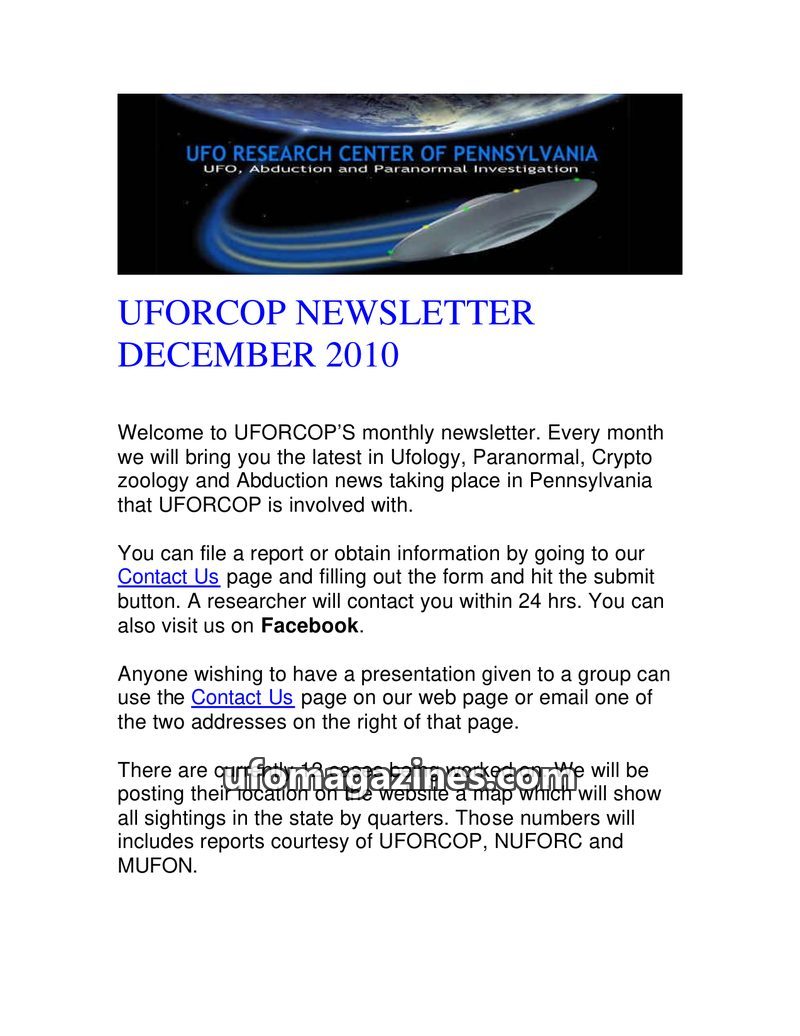 The December 2010 UFORCOP Newsletter highlights the organization's ongoing investigations into UFO, Paranormal, Cryptozoology, and Abduction cases in Pennsylvania. The newsletter d