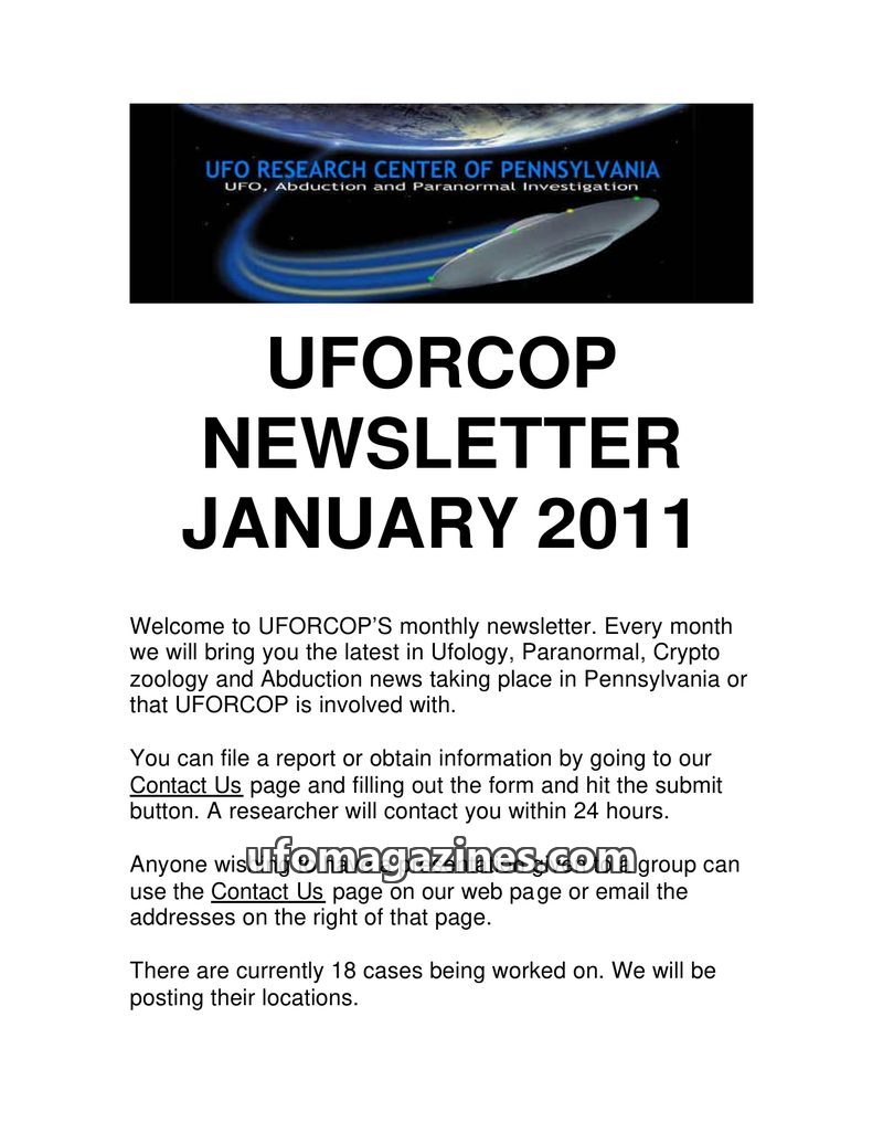 The January 2011 UFORCOP Newsletter from the UFO Research Center of Pennsylvania highlights ongoing investigations into UFOs, Cryptozoology, and the Paranormal. The organization is