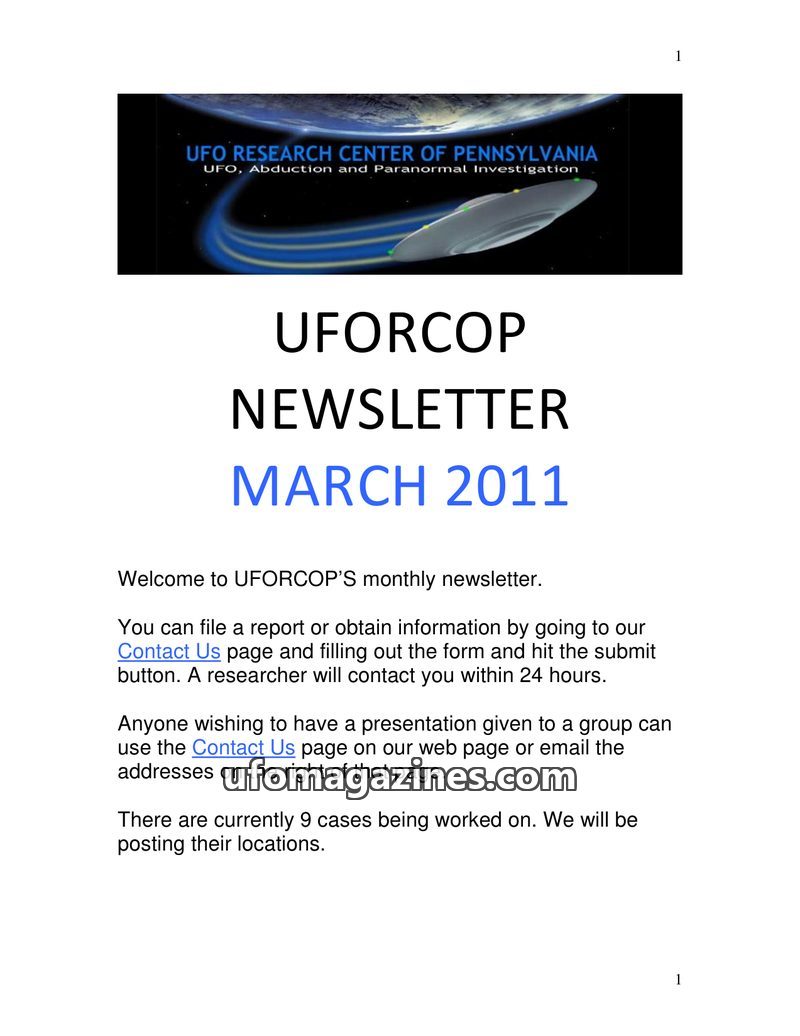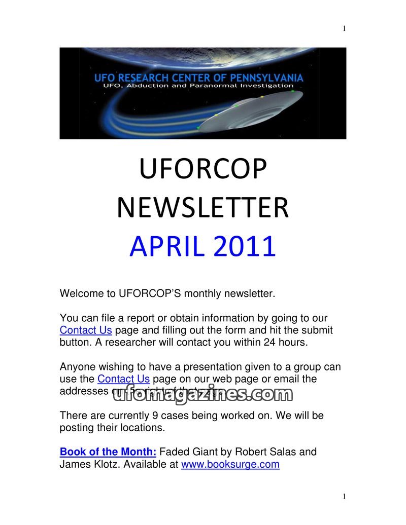 This is the first monthly newsletter from UFORCOP (UFO Research Center of Pennsylvania), covering Ufology, Paranormal, Crypto zoology, and Abduction news in Pennsylvania. The organ