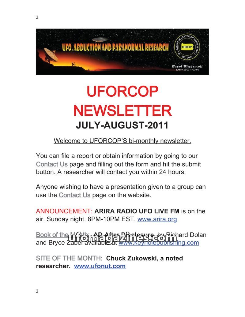 This issue of the UFORCOP Newsletter covers July-August 2011. It highlights the organization's ongoing investigations in various states and countries, and their availability for sp