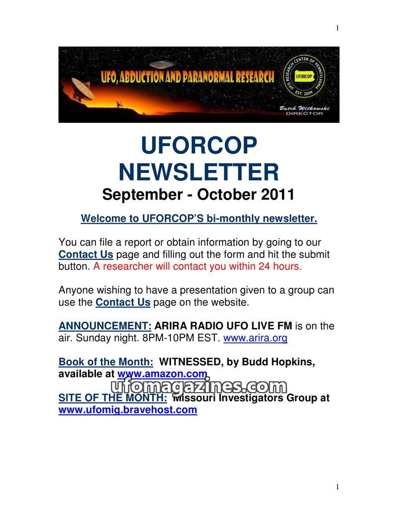 This issue of the UFORCOP Newsletter covers September-October 2011. It highlights ongoing investigations, including a second trip to Morganton, NC, to study the Brown Mountain Ligh