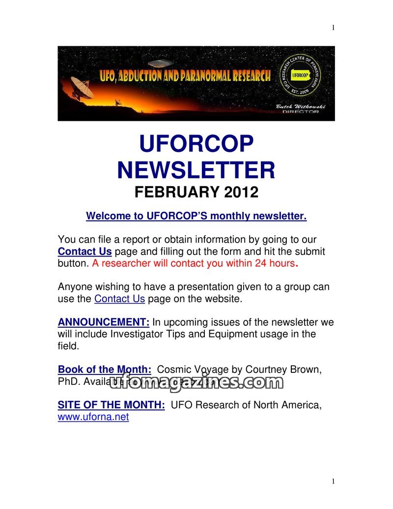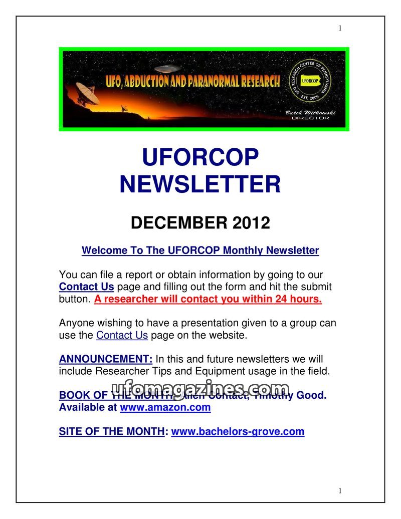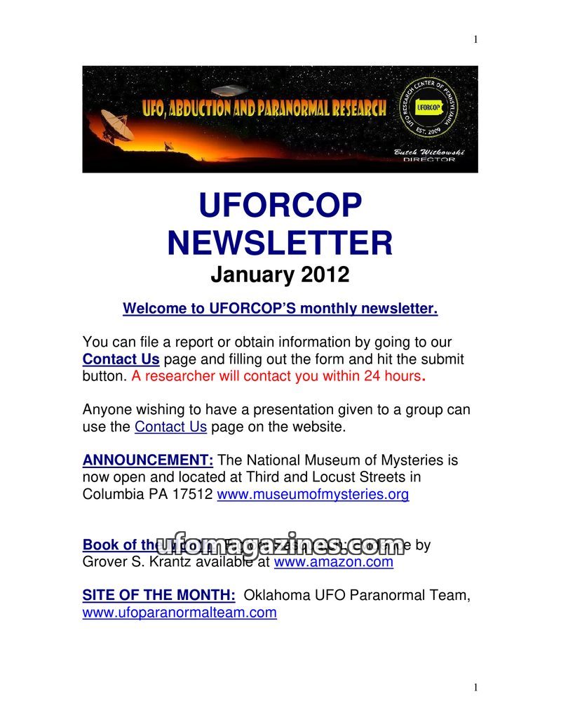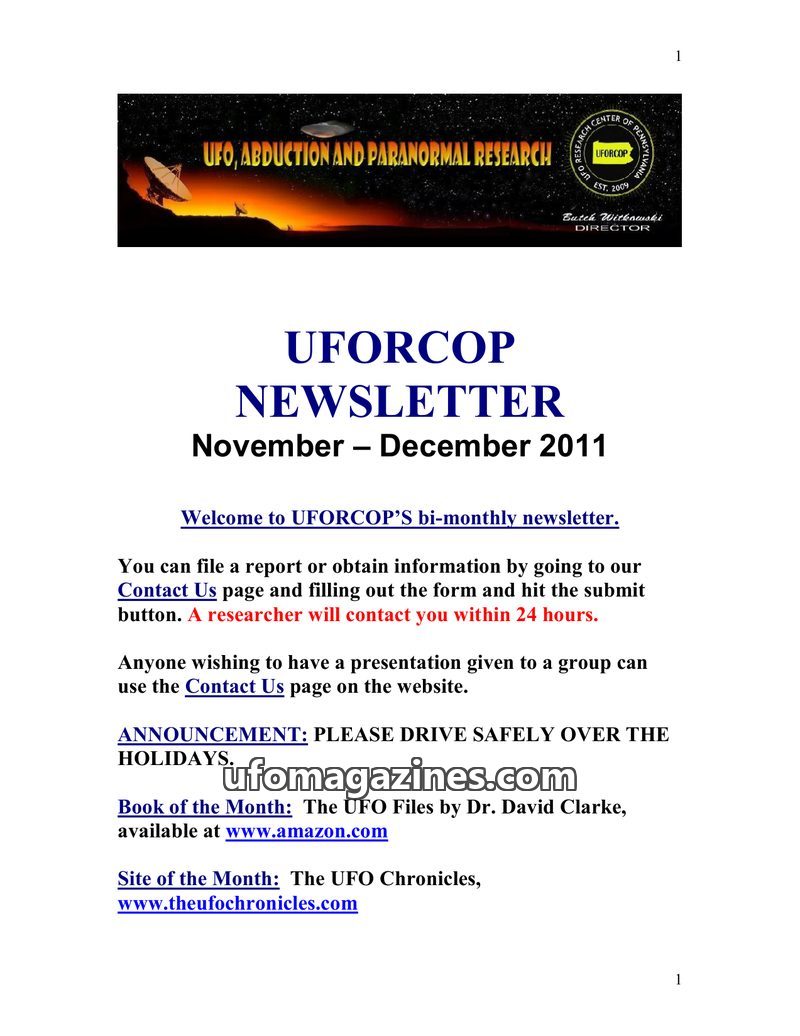 This bi-monthly newsletter from UFORCOP covers UFO research and paranormal investigations. It announces the return to a monthly format in January 2012 and highlights ongoing resear