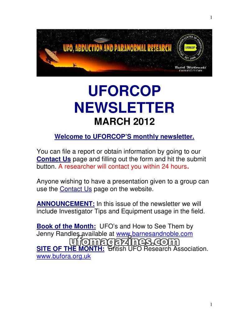This March 2012 UFORCOP Newsletter covers various aspects of paranormal research, including UFO sightings, crypto zoology, and paranormal investigations. It highlights the organiza