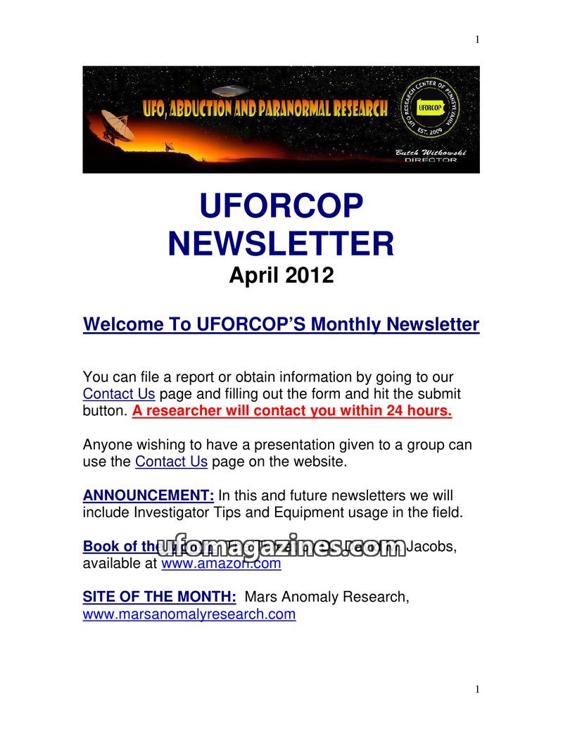 This April 2012 UFORCOP Newsletter introduces the organization's services, including filing reports and offering presentations. It highlights a 'Book of the Month' and a 'Site of t