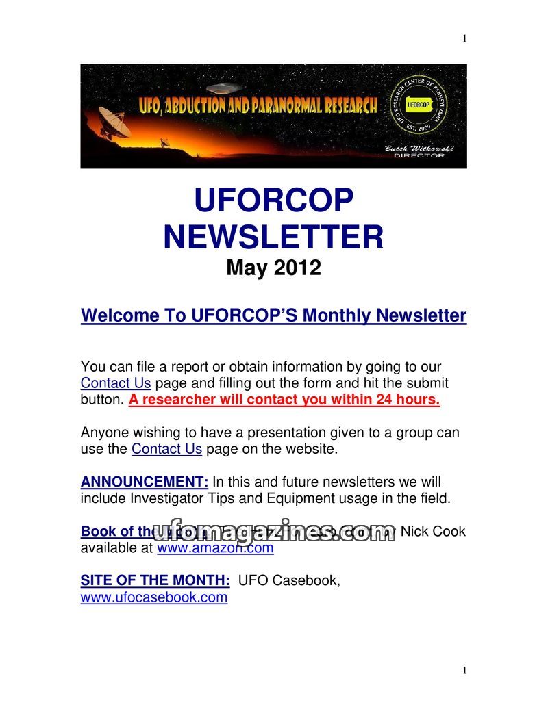 The May 2012 UFORCOP Newsletter announces the arrival of a new mobile investigation unit and highlights the 'Book of the Month' and 'Site of the Month'. It details how to report UF