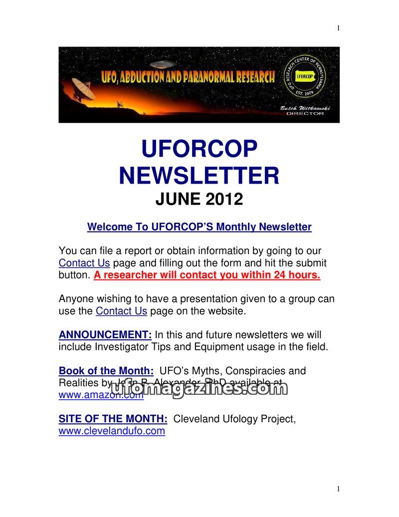 This June 2012 UFORCOP newsletter covers UFO investigations in Pennsylvania and other regions, including a request for specific sightings in Florida from 1975-1977. It details upco