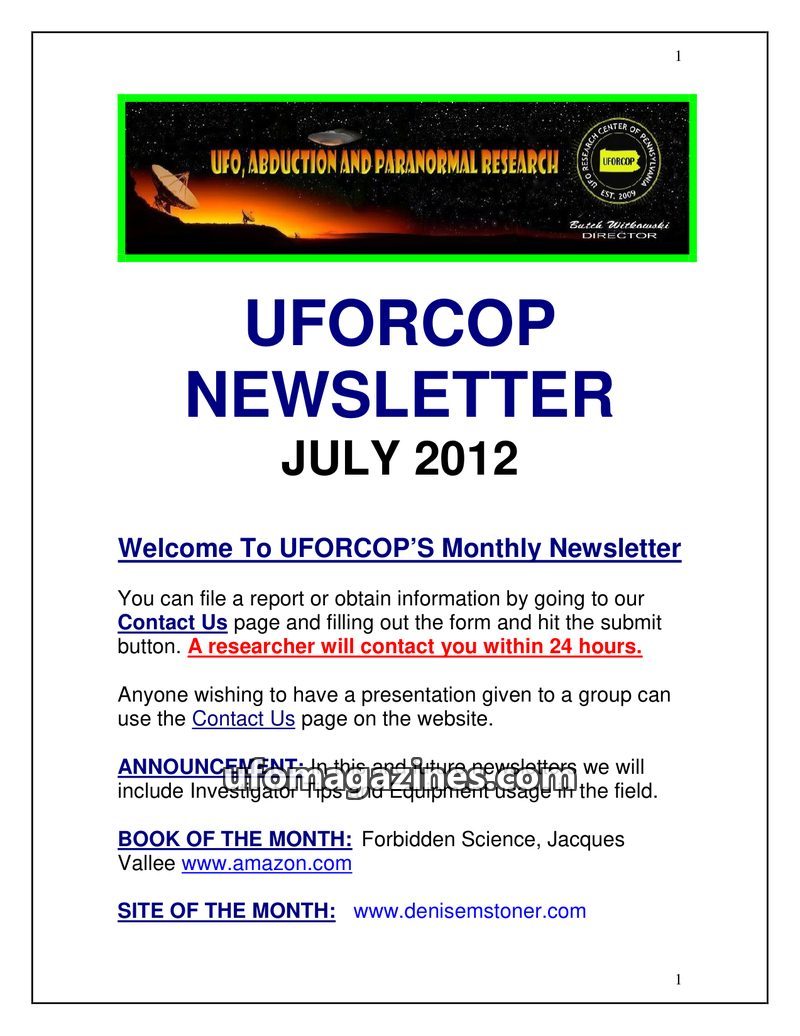This July 2012 UFORCOP Newsletter introduces the organization's services, including UFO case research and paranormal investigations. It highlights upcoming activities like a parano