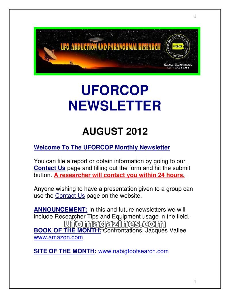 The August 2012 UFORCOP Newsletter announces the organization's activities, including researching UFO cases, conducting paranormal investigations at Gettysburg Battlefield, and exp