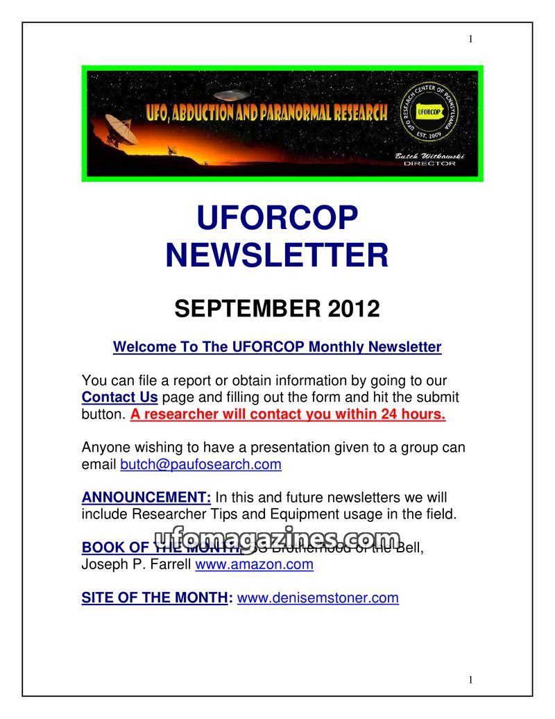 The September 2012 UFORCOP Newsletter covers UFO research in Pennsylvania and other countries, with a focus on reporting sightings and investigations. It announces a paranormal inv