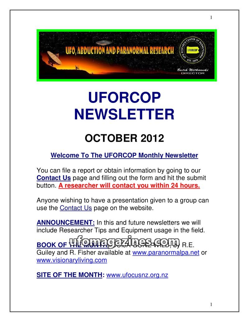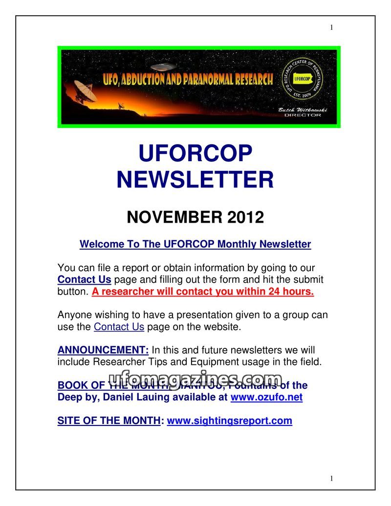 This November 2012 UFORCOP Newsletter covers various paranormal and UFO-related topics. It details how to report sightings, announces upcoming research in Gettysburg, and lists cre