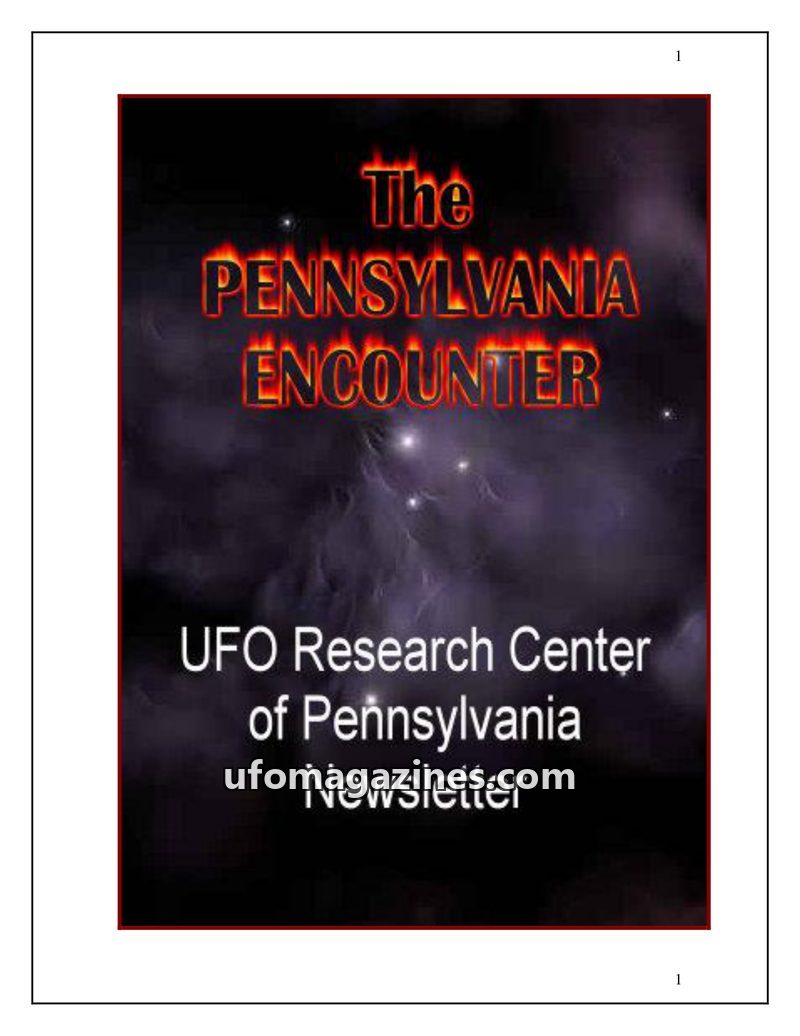 This issue of Pennsylvania Encounter, a monthly newsletter from the UFO Research Center of Pennsylvania (UFORCOP), focuses on UFO research, paranormal events, and cryptozoology. It