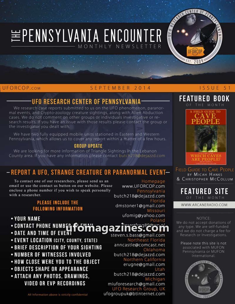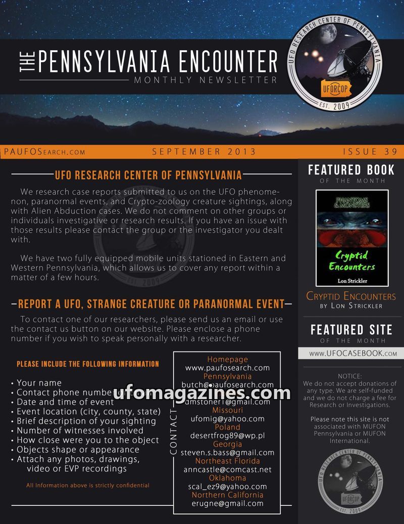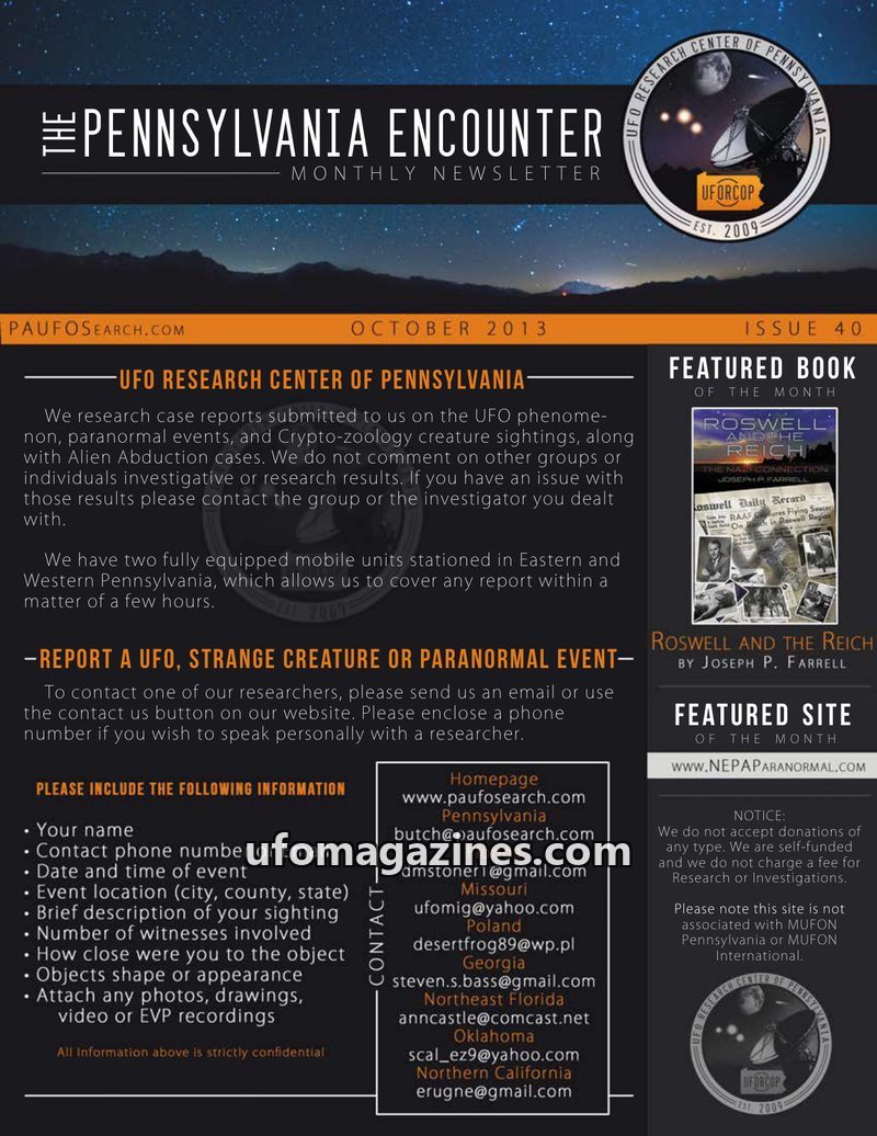 The October 2013 issue of Pennsylvania Encounter, a monthly newsletter from the UFO Research Center of Pennsylvania (UFORCOP), details the organization's research into UFO phenomen