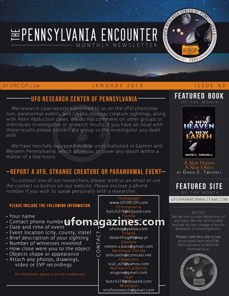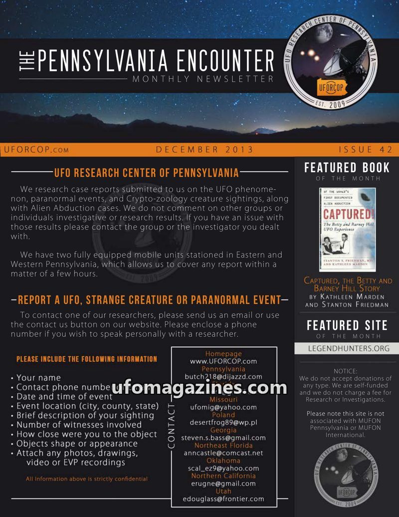 The December 2013 issue of Pennsylvania Encounter, a newsletter from the UFO Research Center of Pennsylvania (UFORCOP), announces their newly redesigned website launched on January