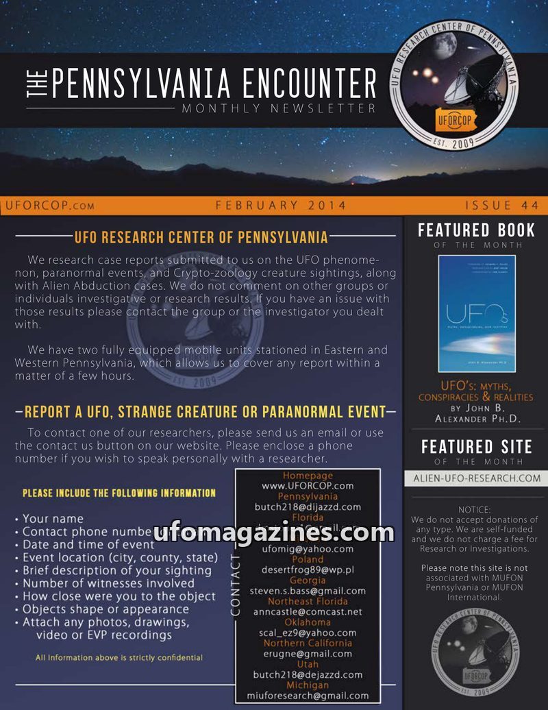 The February 2014 issue of Pennsylvania Encounter, a monthly newsletter from the UFO Research Center of Pennsylvania, focuses on UFO phenomena, paranormal events, and crypto-zoolog