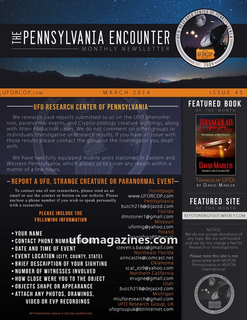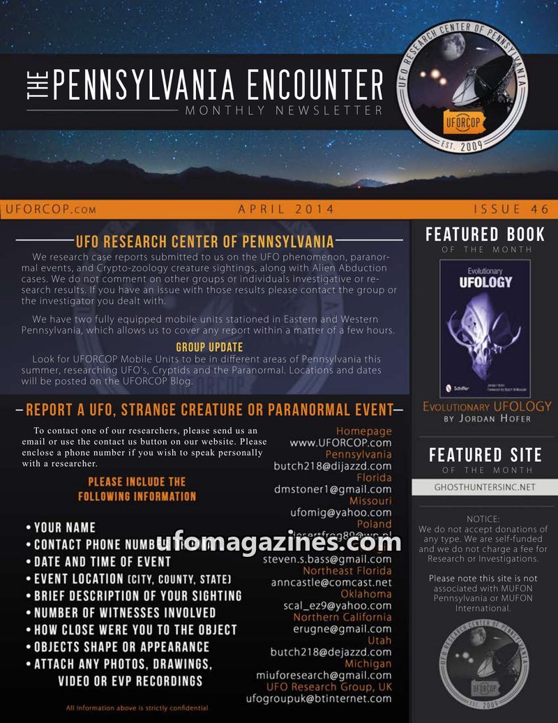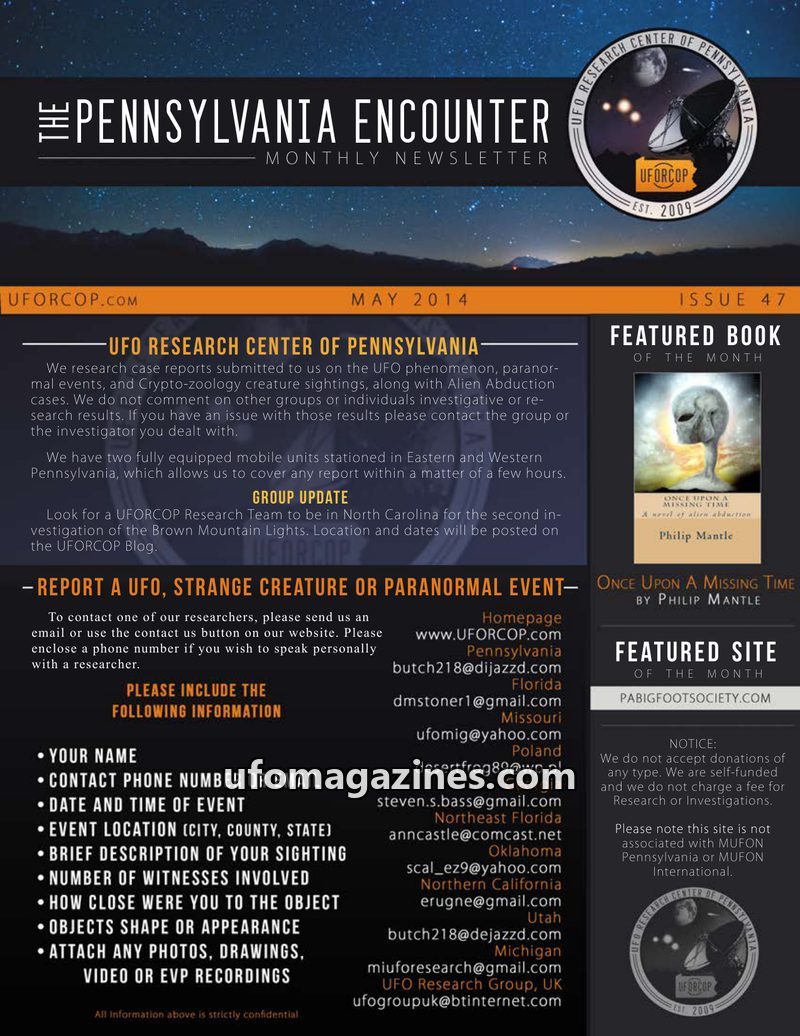 This issue of the Pennsylvania Encounter newsletter from May 2014, published by the UFO Research Center of Pennsylvania (UFORCOP), focuses on their ongoing research into UFO phenom