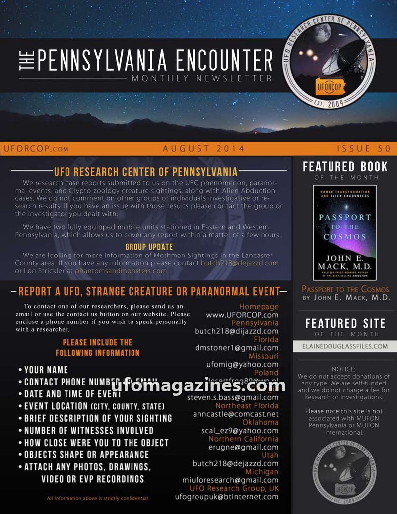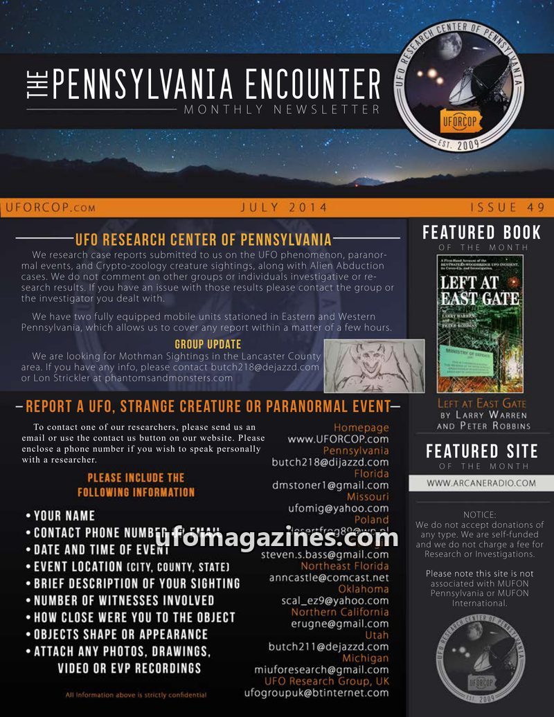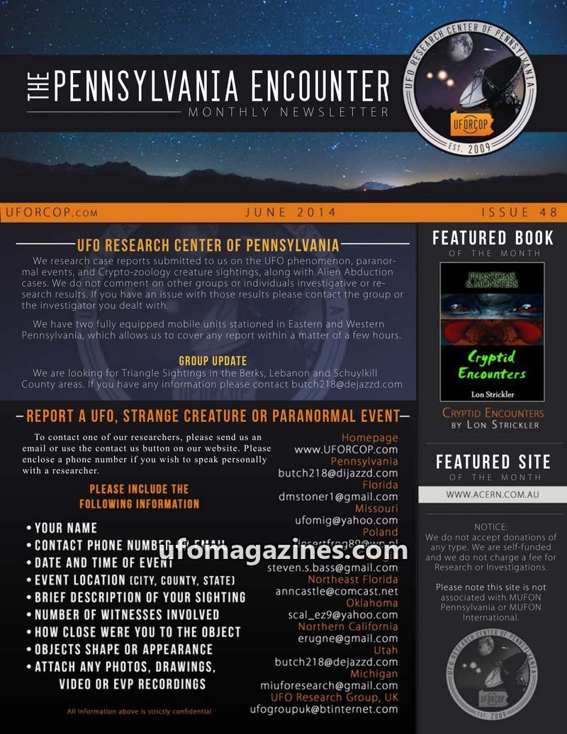 This July 2014 issue of the Pennsylvania Encounter newsletter from the UFO Research Center of Pennsylvania details their ongoing research into UFOs, paranormal events, and cryptozo
