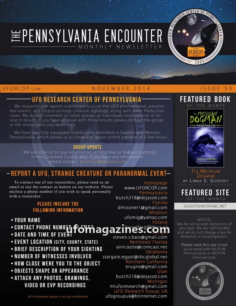 This issue of Pennsylvania Encounter, published in November 2014 by the UFO Research Center of Pennsylvania (UFORCOP), focuses on research into UFOs, paranormal events, cryptozoolo