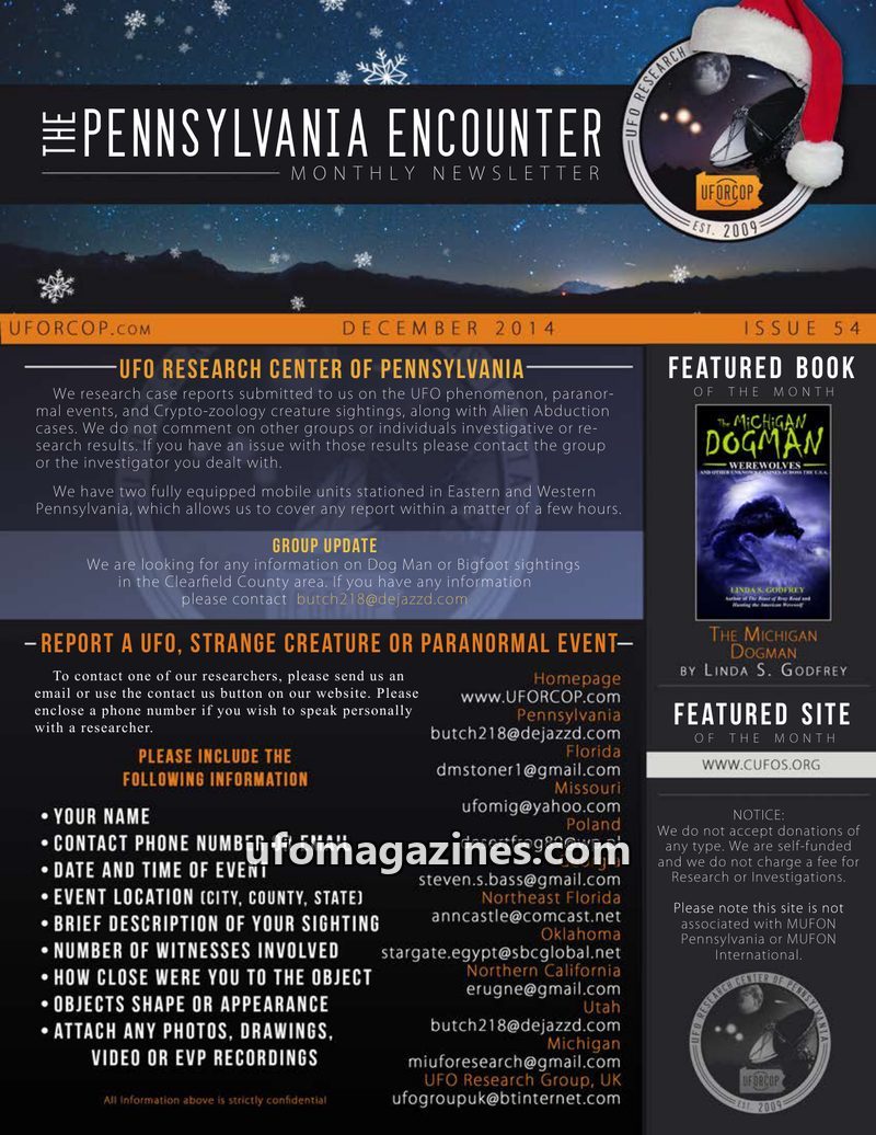 This December 2014 issue of the Pennsylvania Encounter newsletter from the UFO Research Center of Pennsylvania (UFORCOP) focuses on ongoing research into UFO phenomena, paranormal