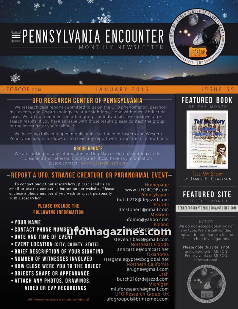 This January 2015 issue of the Pennsylvania Encounter newsletter from the UFO Research Center of Pennsylvania (UFORCOP) details their research into UFOs, paranormal events, and cry