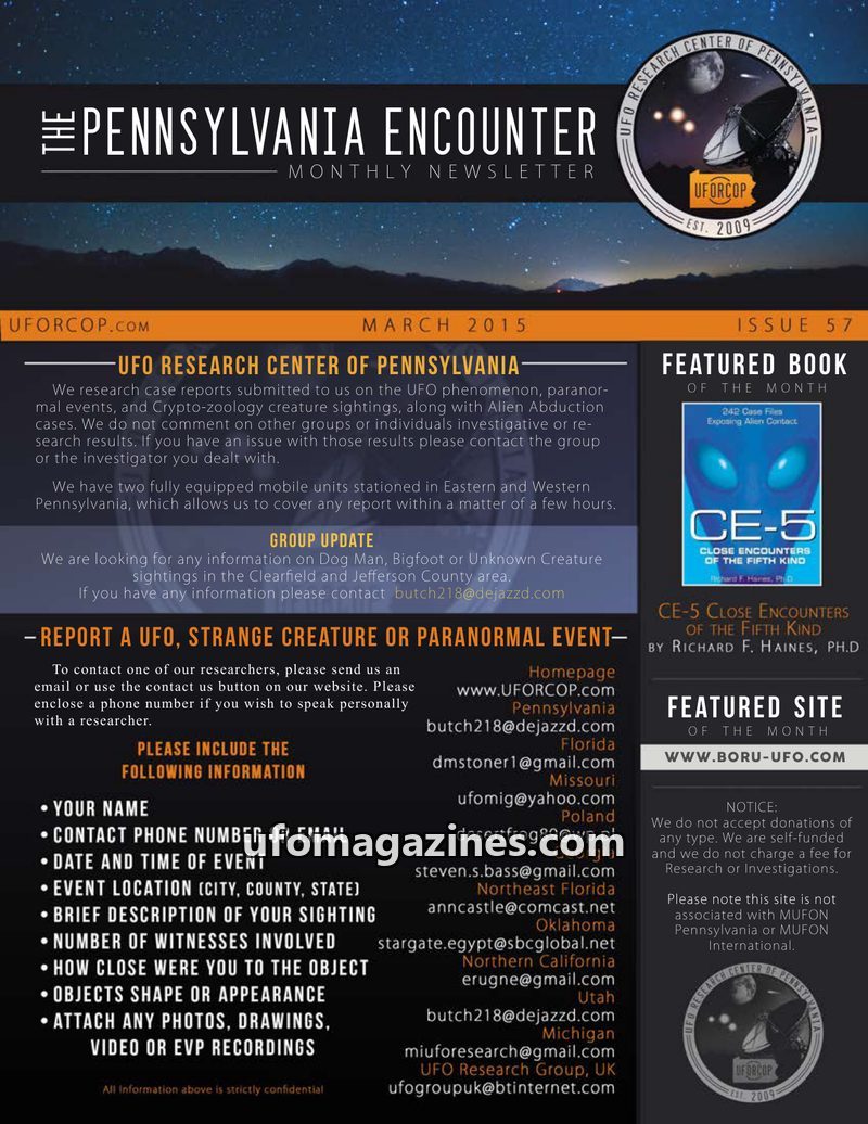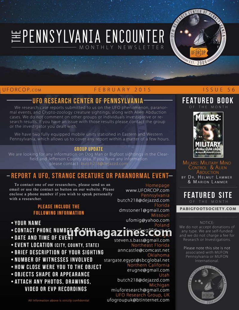 This issue of the Pennsylvania Encounter newsletter from the UFO Research Center of Pennsylvania (UFORCOP) for February 2015 covers ongoing research into UFOs, paranormal events, c