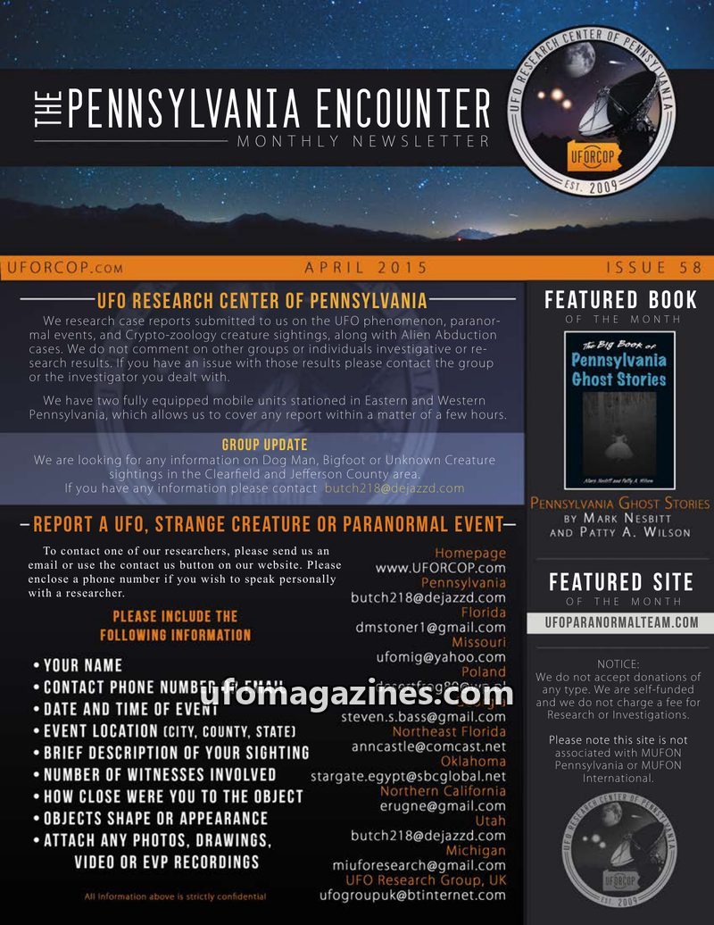 The April 2015 issue of Pennsylvania Encounter, a monthly newsletter from the UFO Research Center of Pennsylvania (UFORCOP), details the organization's research into UFOs, paranorm
