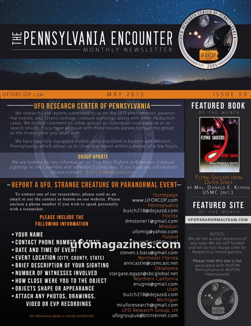 This issue of the Pennsylvania Encounter newsletter from May 2015, published by the UFO Research Center of Pennsylvania (UFORCOP), details their ongoing research into UFOs, paranor