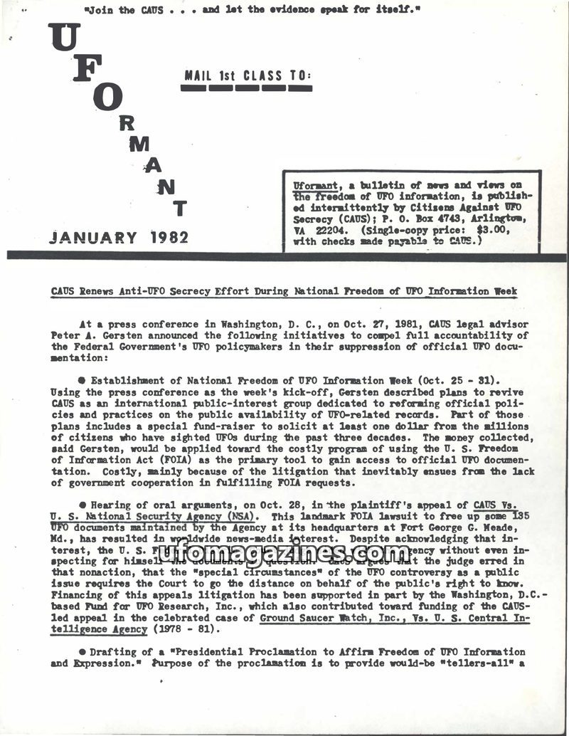 Citizens Against UFO Secrecy (CAUS) launched National Freedom of UFO Information Week in October 1981, aiming to compel government accountability regarding UFO documentation. CAUS