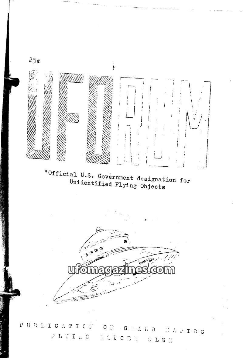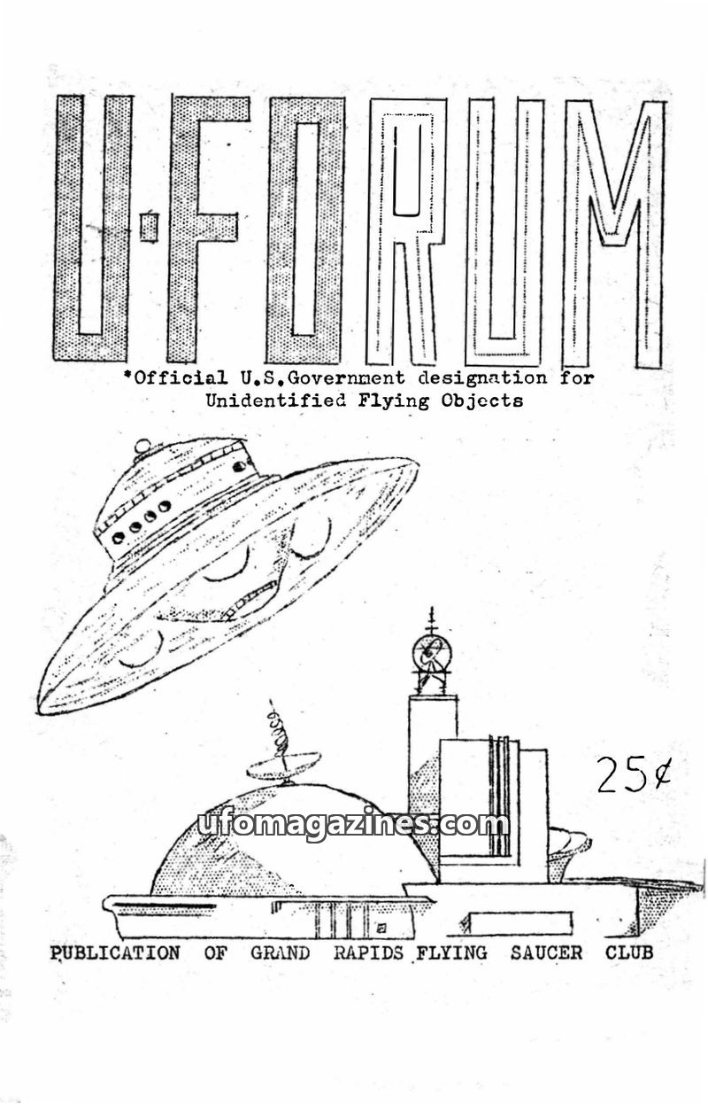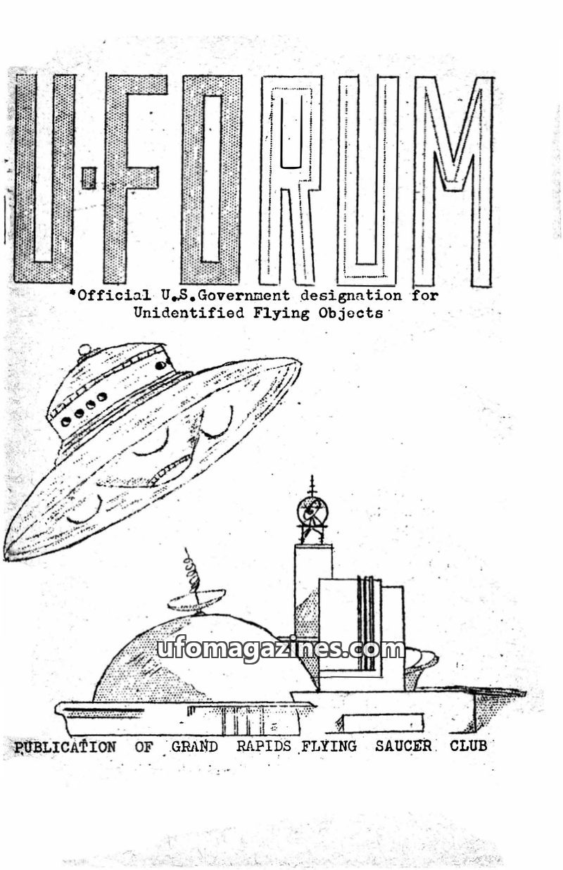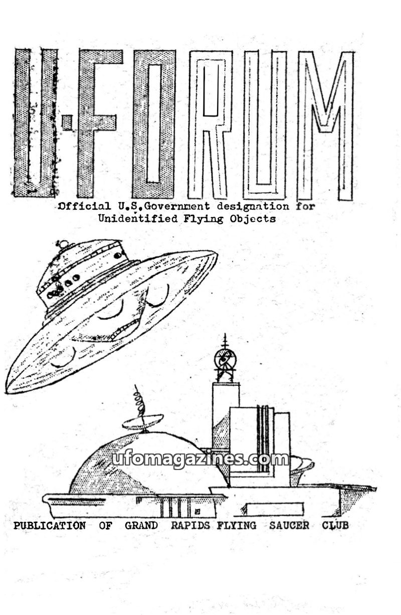 This issue of UFOrum, published by the Grand Rapids Flying Saucer Club, covers UFO sightings and related research from the 1950s. It includes a detailed account of a sighting by J.
