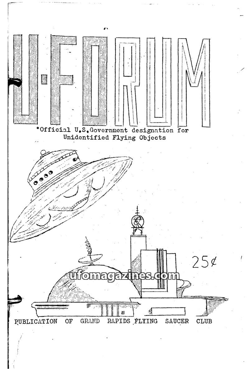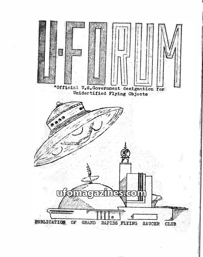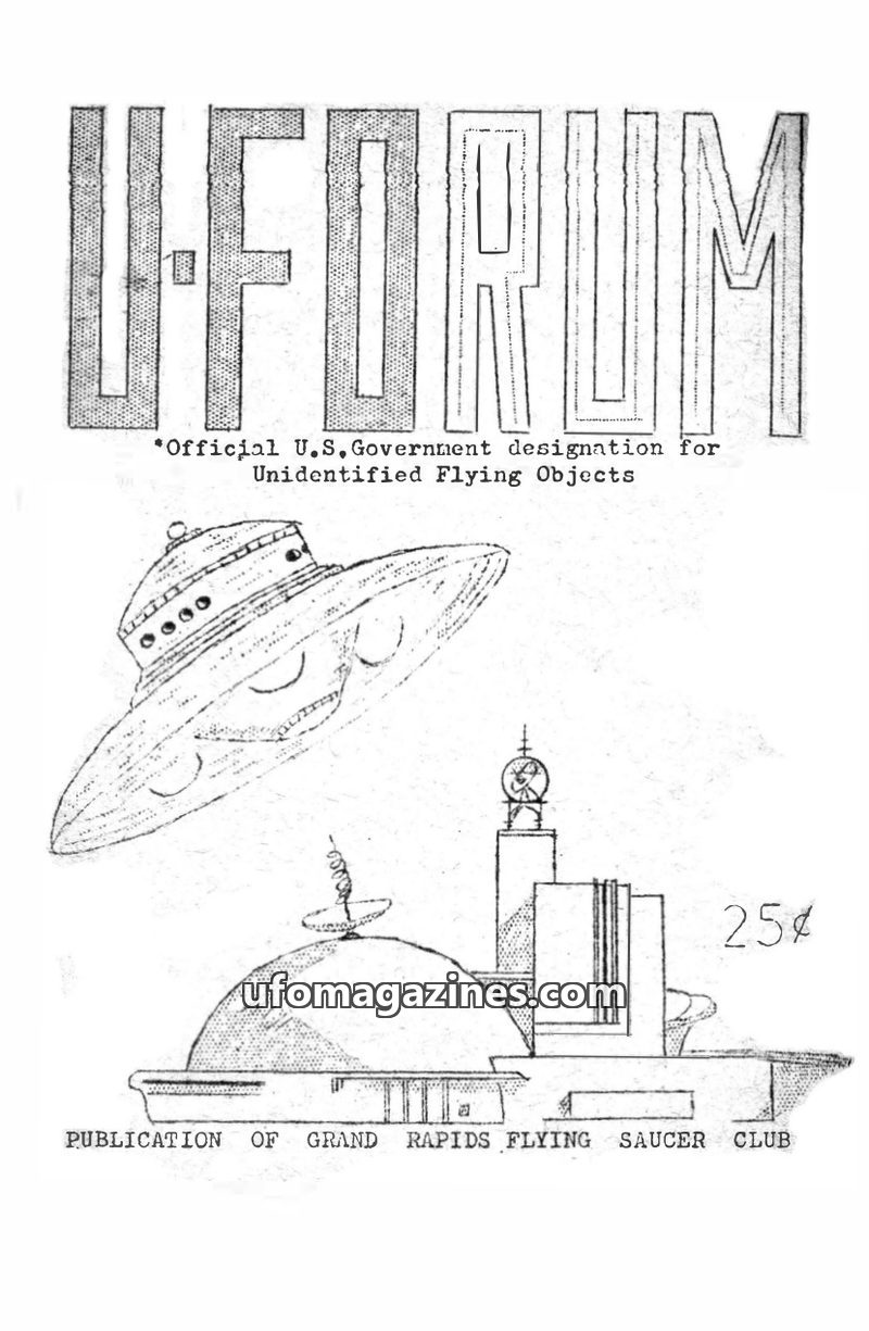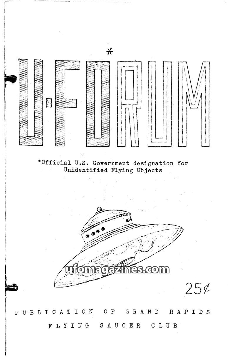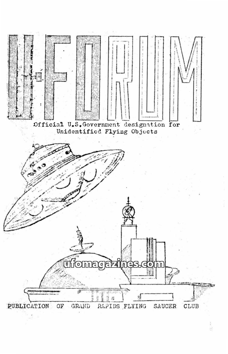 This issue of UFOrum, published by the Grand Rapids Flying Saucer Club, covers UFO sightings and related research from the 1950s. It includes a detailed account of a sighting by J.