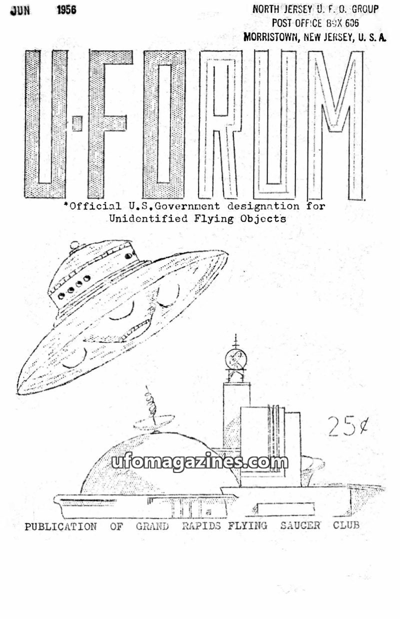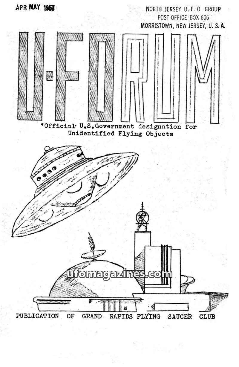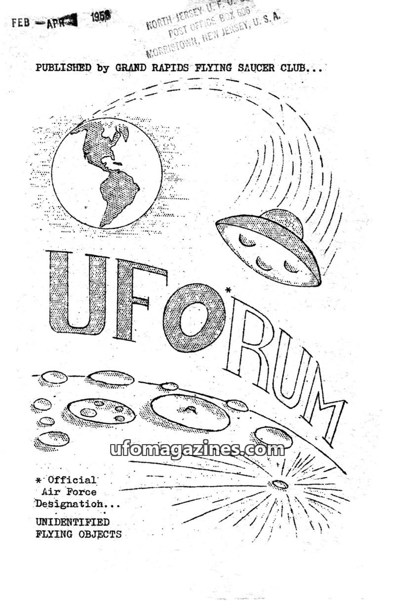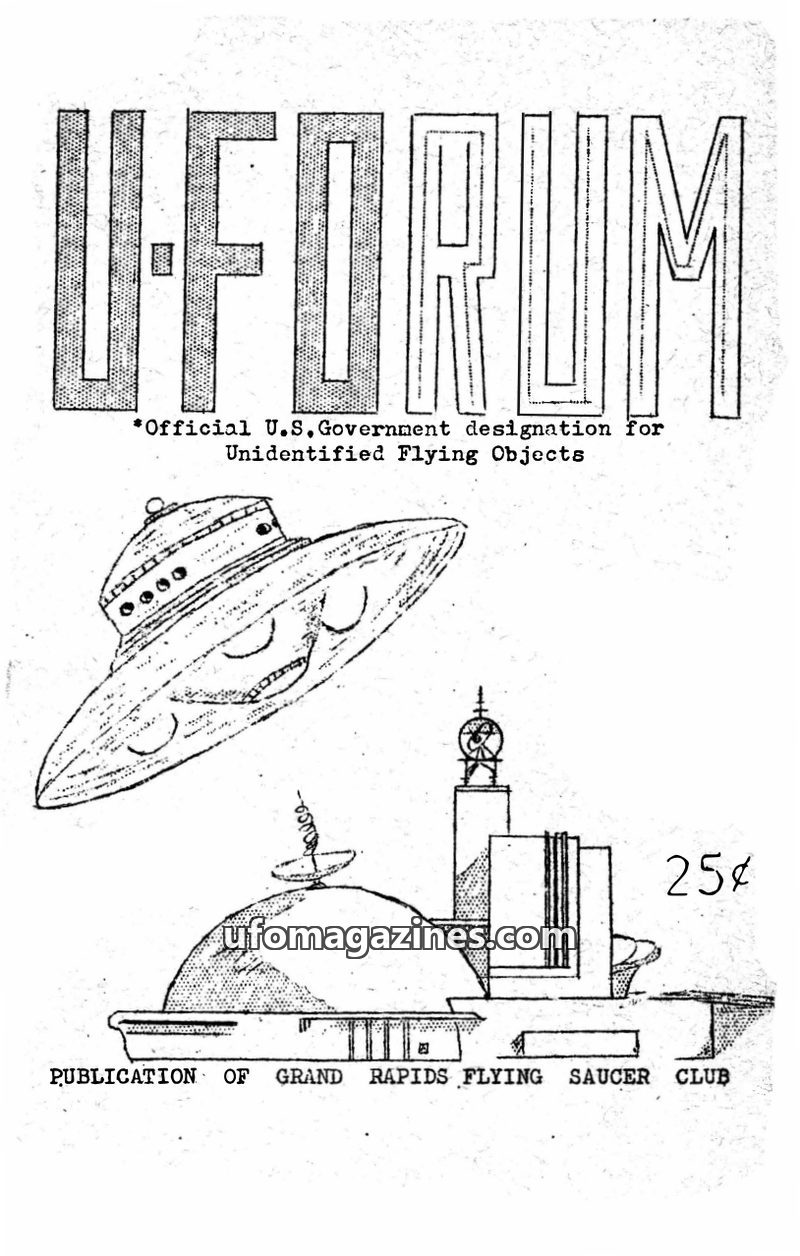 This issue of UFOrum, published by the Grand Rapids Flying Saucer Club, covers UFO sightings and related research from the 1950s. It includes a detailed account of a sighting by J.