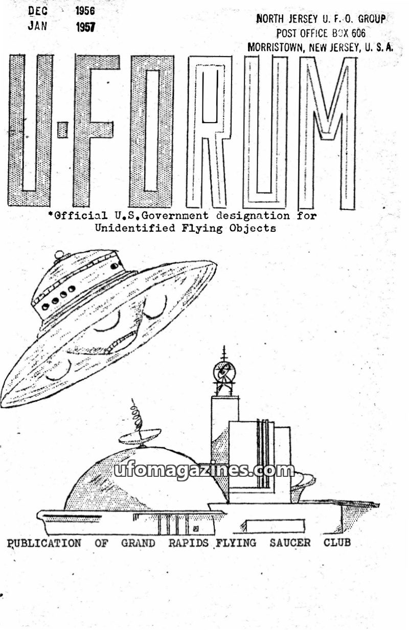 This issue of UFORUM, published by the North Jersey U.F.O. Group, covers December 1956 and January 1957. It announces a new policy of accepting subscriptions on a free-will offerin