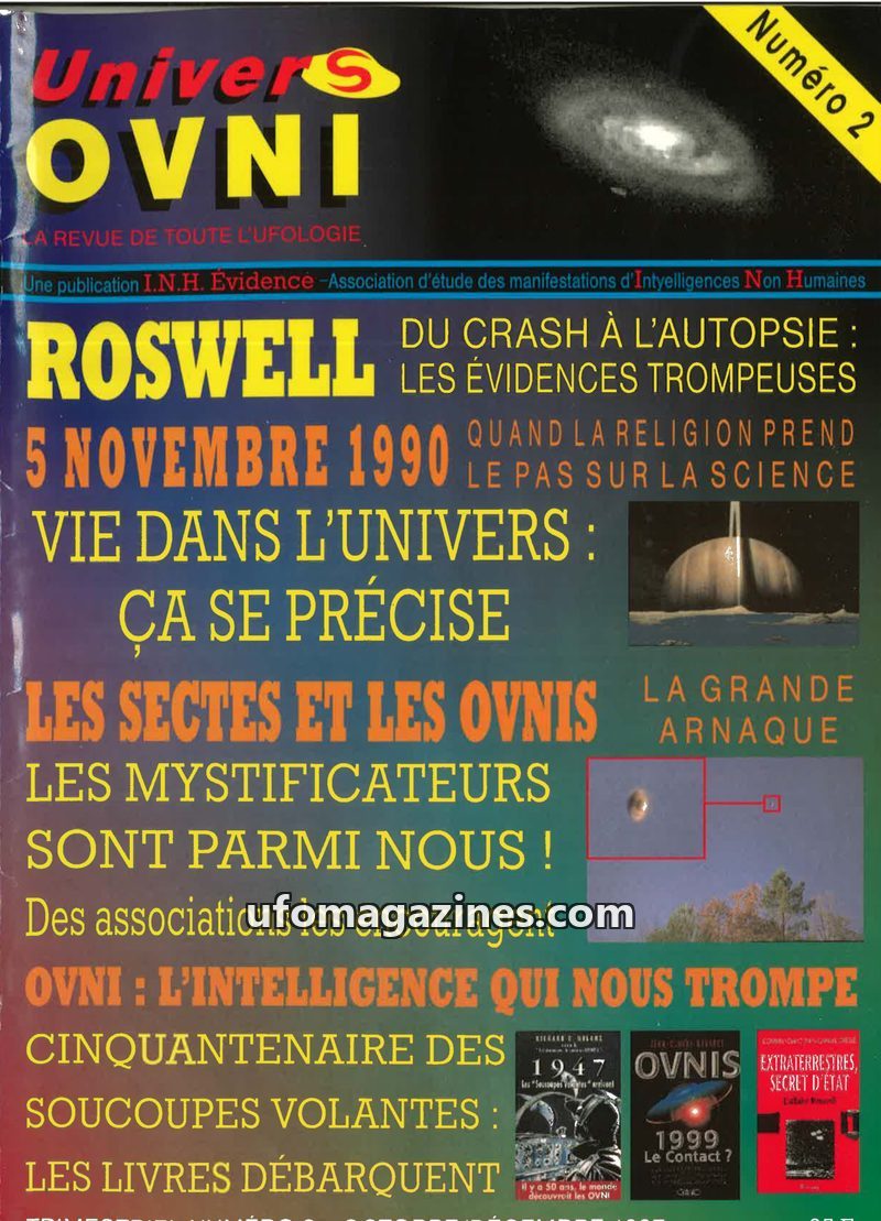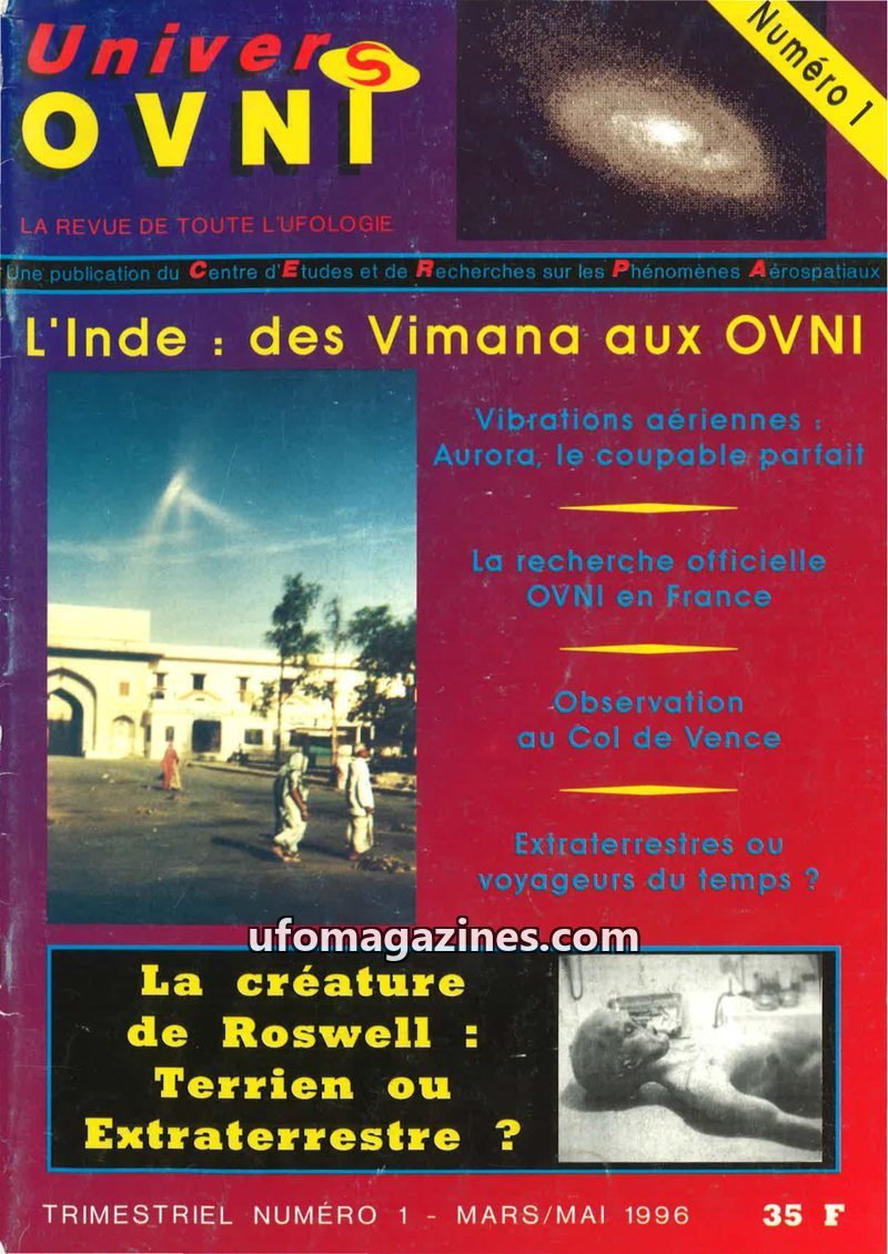 This issue of Univers OVNI delves into various UFO phenomena. It discusses the ancient Indian Vimanas and their connection to modern UFOs, and investigates the controversial Roswel