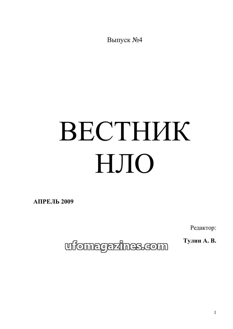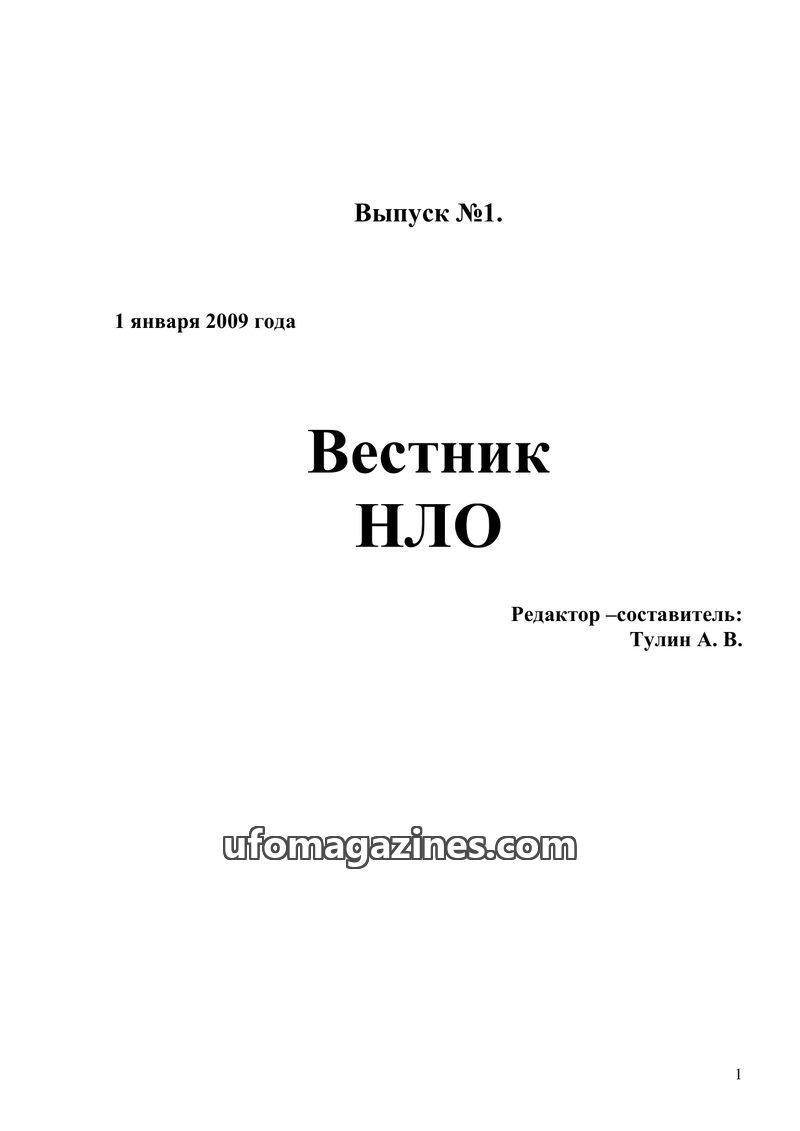 This issue of 'UFO Herald' (Вестник НЛО) marks its debut in January 2009, aiming to be a popular science journal on the current state of ufology. The editor, A.V. Tulin, notes ufol