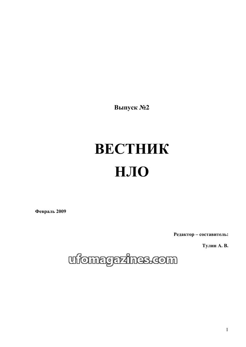 This issue of 'Vestnik NLO' (Herald of UFOs) from February 2009, edited by A. V. Tulin, presents several articles on UFO phenomena and related topics. It includes discussions on hy